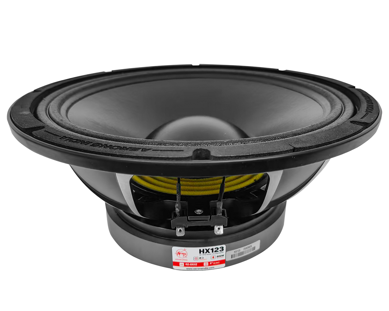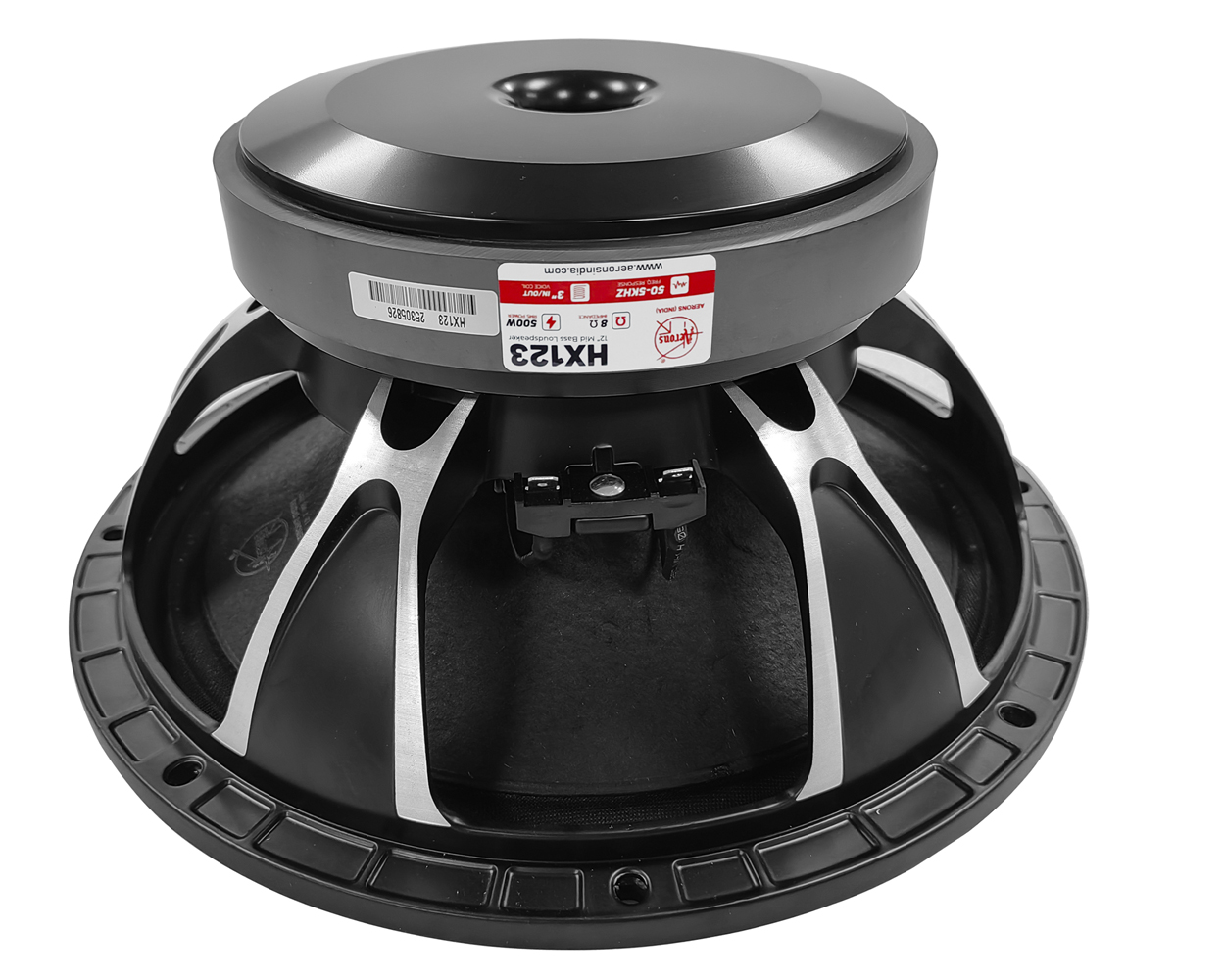 The AERONS HX123 is a high-performance 12-inch mid loudspeaker crafted for clear, detailed and natural mid-range output. Built with an exclusive heavy-duty chassis, it ensures strong durability and stable performance even in continuous use. Delivering 500W RMS power, the HX123 covers a wide 50Hz–5kHz frequency range, making it ideal for rich mids and smooth, expressive vocals. Its 3-inch in/out voice coil provides excellent heat handling, while the 8-ohm impedance ensures broad amplifier compatibility. The HX123 is a reliable choice for professional PA systems requiring clean mid clarity and consistent sound quality.
